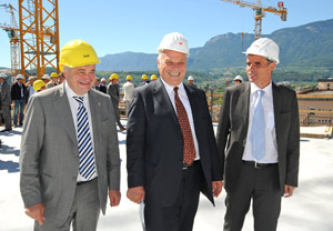 LPA - Über den Stand der Bauarbeiten am Krankenhaus in Bozen haben sich Landeshauptmann Luis Durnwalder und die Landesräte Florian Mussner, Richard Theiner und Christian Tommasini heute, 1. September, vor Ort informiert. Derzeit wird an der 255.000 Kubikmeter großen und 237 Millionen Euro teuren neuen Klinik gebaut, die bis 2015 fertig sein soll.