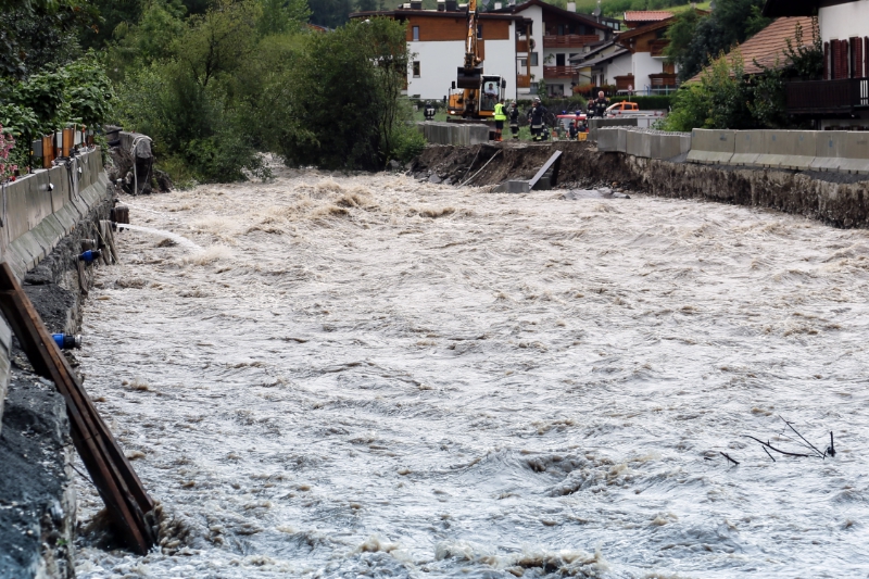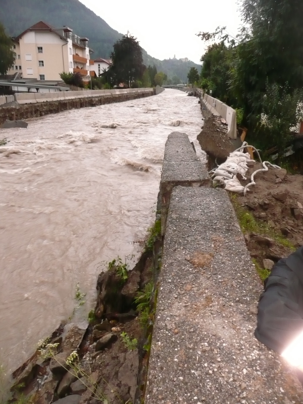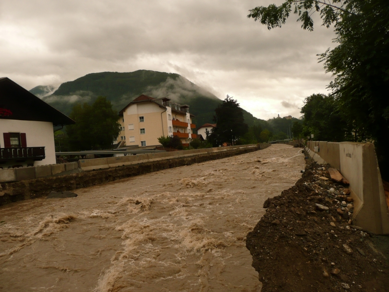 Die Arbeiten im Eisack konnten in den Sommermonaten wegen der gefährlichen Hochwassersituation nicht weitergeführt werden. So stieg etwa im August der Wasserspiegel innerhalb weniger Stunden bedenklich an, der Fluss drohte über die Ufer zu treten. Erst im Herbst konnte gefahrlos gearbeitet werden.