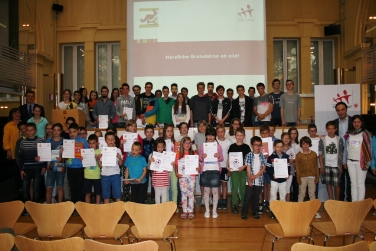 An der heutigen Feier im Palais Widmann nahmen neben Dutzender Schüler und Schülerinnen auch Lehrpersonen, Schulführungskräfte, Eltern und Großeltern teil. Mit dabei war die Inspektorin für den mathematisch-naturwissenschaftlichen Bereich am Deutschen Schulamt, Marta Herbst, die den Wettbewerb koordiniert.