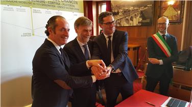Ein ehrgeiziges aber realistisches Projekt mit großem Potenzial für die Dolomiten – so bezeichnet Arno Kompatscher die geplante Zugverbindung zwischen dem Pustertal und dem Cadore. Der Landeshauptmann und der Präsident der Region Venetien, Luca Zaia, haben heute (13. Februar) das entsprechende Einvernehmensprotokoll unterzeichnet. Mit dabei: Minister Graziano Delrio.