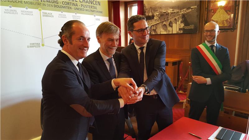 „Die Erreichbarkeit ist eine der Prioritäten des Landes Südtirol in Sachen öffentlicher Nahverkehr, nicht nur innerhalb der Landesgrenzen, sondern auch darüber hinaus“, betont Landeshauptmann Arno Kompatscher heute in Cortina d’Ampezzo. „Deshalb hat die Landesregierung grünes Licht gegeben, um das Projekt der Bahnstrecke Pusteral – Cadore konkret auf den Weg zu bringen. Mit der heutigen Unterschrift haben wir den Startschuss für die Machbarkeitsstudie gegeben“, so Kompatscher. Gemeinsam mit dem Präsidenten der Region Venetien, Luca Zaia, hat der Landeshauptmann heute im Rathaus von Cortina d’Ampezzo das entsprechende Einvernehmensprotokoll unterzeichnet. Die zusätzliche Gegenwart des Ministers für Infrastrukturen und Transport, Graziano Delrio, hat die Bedeutung dieses Projektes unterstrichen.