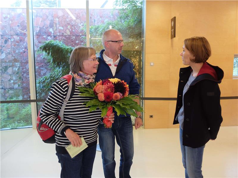 Das Ehepaar kommt aus Altenburg in Thüringen, an der Landesgrenze zu Sachsen. Das Paar hat schon drei Mal seinen Urlaub in Südtirol verbracht, sich nach Aufenthalten in Meransen heuer für Schenna entschieden und heute zum ersten Mal die nahegelegenen Gärten von Schloss Trauttmansdorff und das Touriseum besucht. Die Koordinatorin der Gärten von Schloss Trauttmansdorff Gabriele Pircher hat dem Ehrengast ein Geschenk überreicht, das sechs Highlights - wie eine Gartenführung und ein Mittagessen im Restaurant Schlossgarten - beinhaltet.