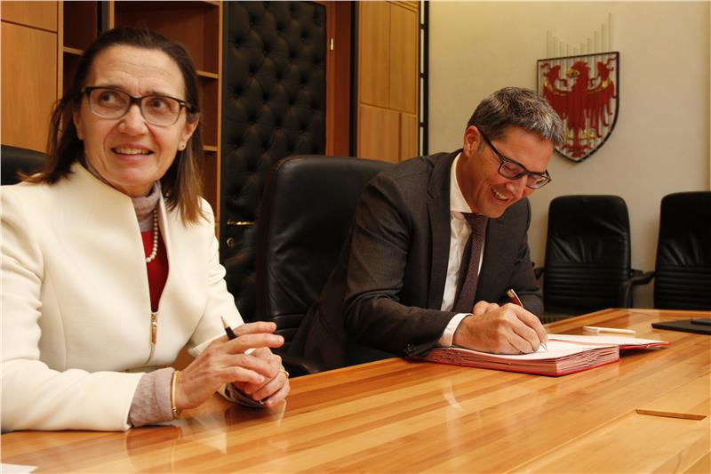 Heute haben Landeshauptmann Arno Kompatscher und die Leiterin der regionalen Direktion der Agentur für Staatseigentum, Rosalia Cannada-Bartoli, im Landhaus 1 in Bozen den Vertrag unterzeichnet, mit dem das Gebäude am Bozner Gerichtsplatz, in dem das Landesgericht untergebracht ist, kostenlos ins Eigentum des Landes wechselt. Der Inventarwert des Gerichtsgebäude entspricht 37.970.000 Euro. Das Land Südtirol übernimmt damit auch die außerordentliche Instandhaltung der Liegenschaft und trägt die Kosten für etwaige Erweiterungs- oder Umbauarbeiten, während der Region Trentino-Südtirol die ordentliche Instandhaltung obliegt. Nach der heutigen Unterzeichnung der Übergabeurkunde wird die Eigentumsänderung im Grundbuch vorgenommen. In einem zweiten Schritt wird der Staat dem Land auf demselben Weg die Büroräume des Friedensgerichts im Rennweg 73 in Meran übergeben. Landeshauptmann Kompatscher dankte der regionalen Direktion der Agentur für Staatseigentum und ihrer Leiterin für die gute Zusammenarbeit.