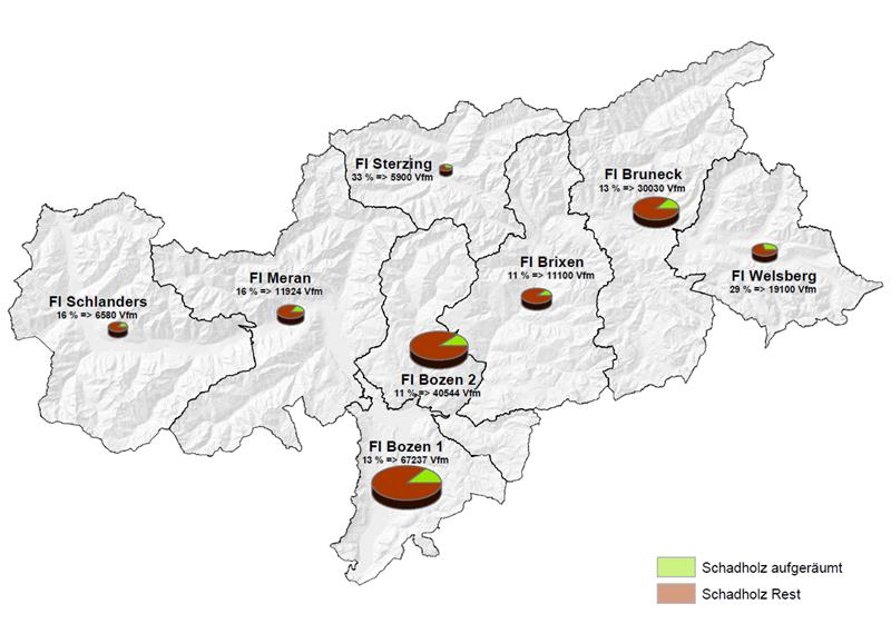 "Die Aufräumarbeiten nach den Unwetter- und Windwurfereignissen von Ende Oktober", berichtet der Direktor der Abteilung Forstwirtschaft Mario Broll, "wurden schon im November aufgenommen, ab Mitte Jänner hat das Forstpersonal den Stand der Arbeiten erhoben: Am 17. Jänner, also zweieinhalb Monate nach dem Unwetter, waren bereits mehr als 200.000 Vorratsfestmeter Schadholz aufgearbeitet". Diese Holzmenge entspricht rund 14 Prozent der geschätzten Sturmholzmenge und etwa einem Drittel der durchschnittlichen landesweiten Nutzungen pro Jahr.