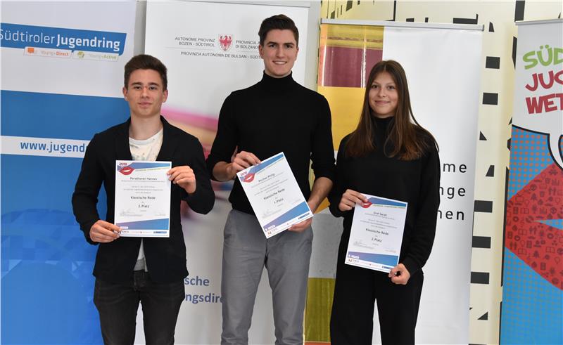 Bei den klassischen Reden setzte sich Philip Pircher von der Wirtschaftsfachoberschule "Heinrich Kunter" in Bozen vor Sarah Graf vom Sozialwissenschaftlichen Gymnasium in Bozen und Hannes Perathoner vom Realgymnasium und der Technologischen Fachoberschule in Meran (beide mit der gleichen Punktezahl) durch.