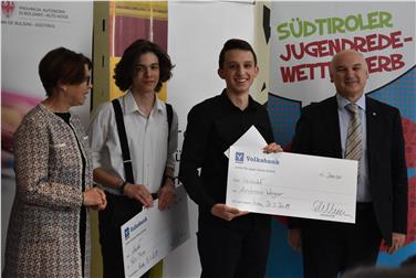 Die Gewinner erhielten einen Preis von 300 Euro, die Zweitplatzierten erhielten 200 Euro, die Drittplatzierten 100 Euro. Die drei besten Redetalente Philip Pircher, Andreas Weger und Felix Maier dürfen Südtirol zudem beim 67. Österreichischen Bundes-Jugendredewettbewerb vom 25. bis 29. Mai in Wien vertreten.