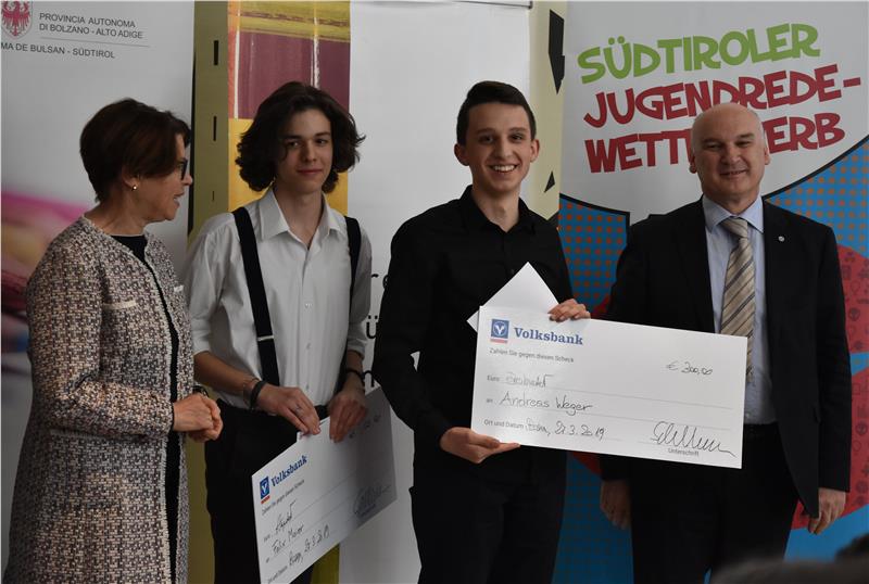 Bei der Spontanrede hingegen glänzte Andreas Weger vom Realgymnasium und der Technologischen Fachoberschule in Meran. Zweite wurde Nora Gostner von der Fachoberschule für Wirtschaft, Grafik und Kommunikation "Julius und Gilbert Durst" in Brixen. Den dritten Platz sicherte sich Felix Maier vom Klassischen, Sprachen- und Kunstgymnasium "Walther von der Vogelweide" in Bozen.