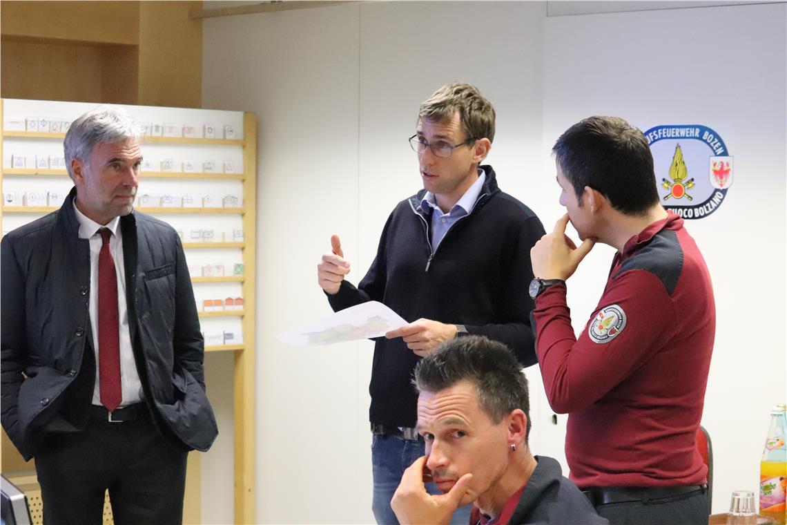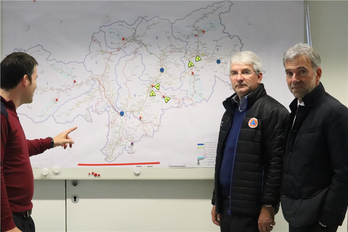 Gadertal und fast alle Nebenstraßen gesperrt, 7600 Abnehmer ohne Strom, 115 Freiwillige Feuerwehren bei Hunderten Einsätzen, Landesrat Schuler im Lagezentrum.