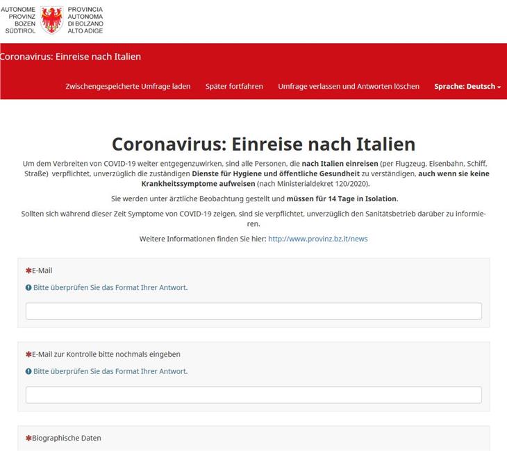 Das neue Onlineformular für Einreisende nach Italien ist über die Coronavirus-Webseite des Landes bzw. über diesen Link zugänglich. Es genügt, die vorgegebenen Datenfelder korrekt auszufüllen und das Formular zu versenden, dann wird der Dienst für Hygiene und öffentliche Gesundheit des Südtiroler Sanitätsbetriebes automatisch informiert. Damit erübrigt sich eine Mitteilung mittels E-Mail.
