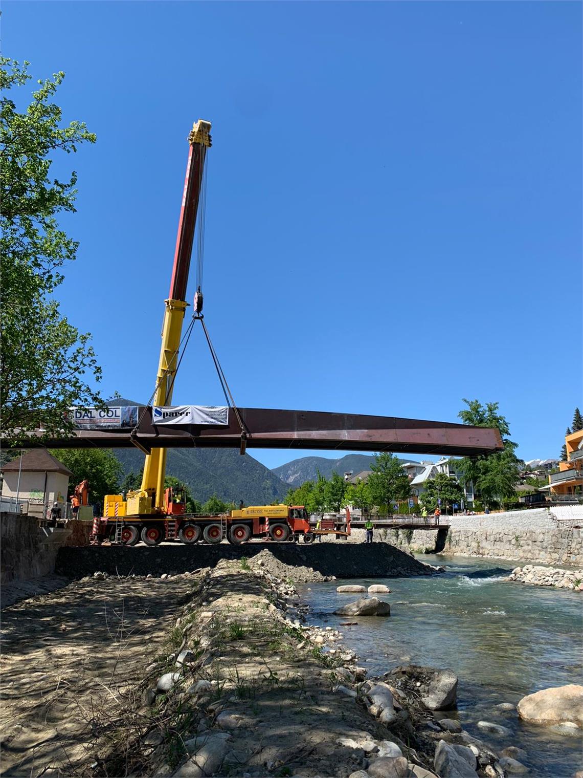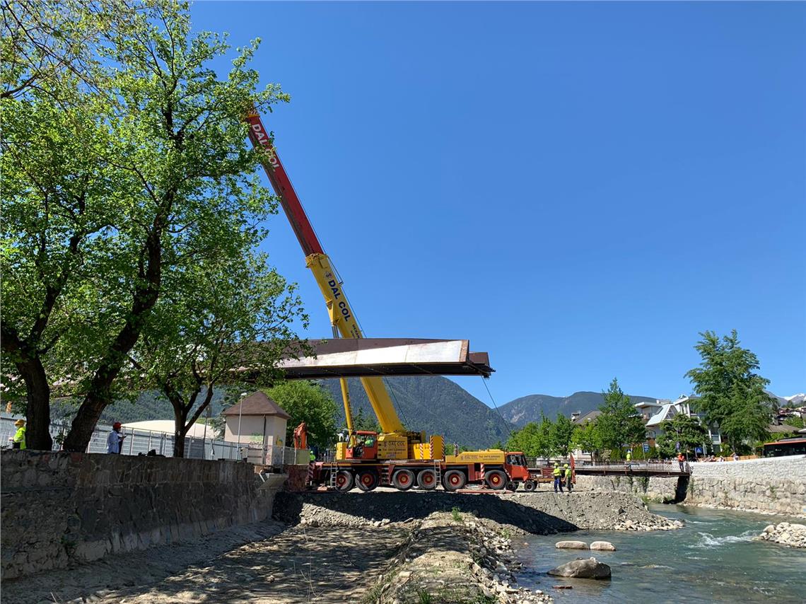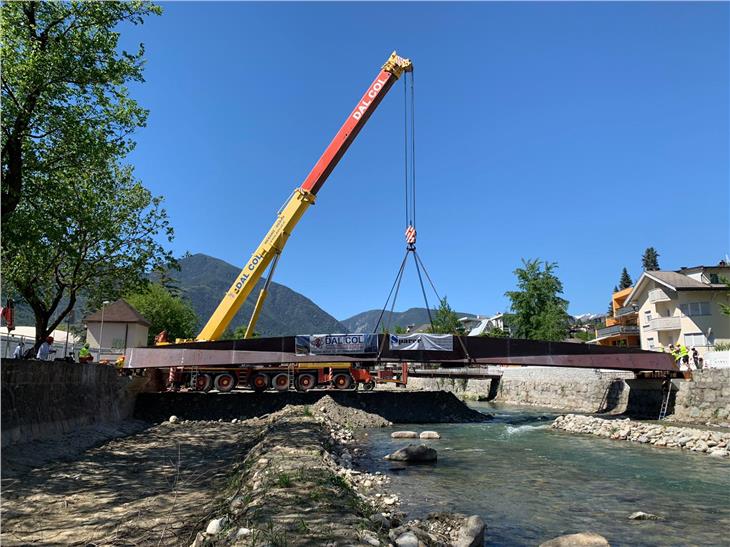 Mit einem Brückeneinhub über den Eisack hat das Landesamt für Wildbach- und Lawinenverbauung Nord heute (7. Mai) seine Arbeiten zur Verbesserung des Hochwasserschutzes von Brixen wieder aufgenommen.