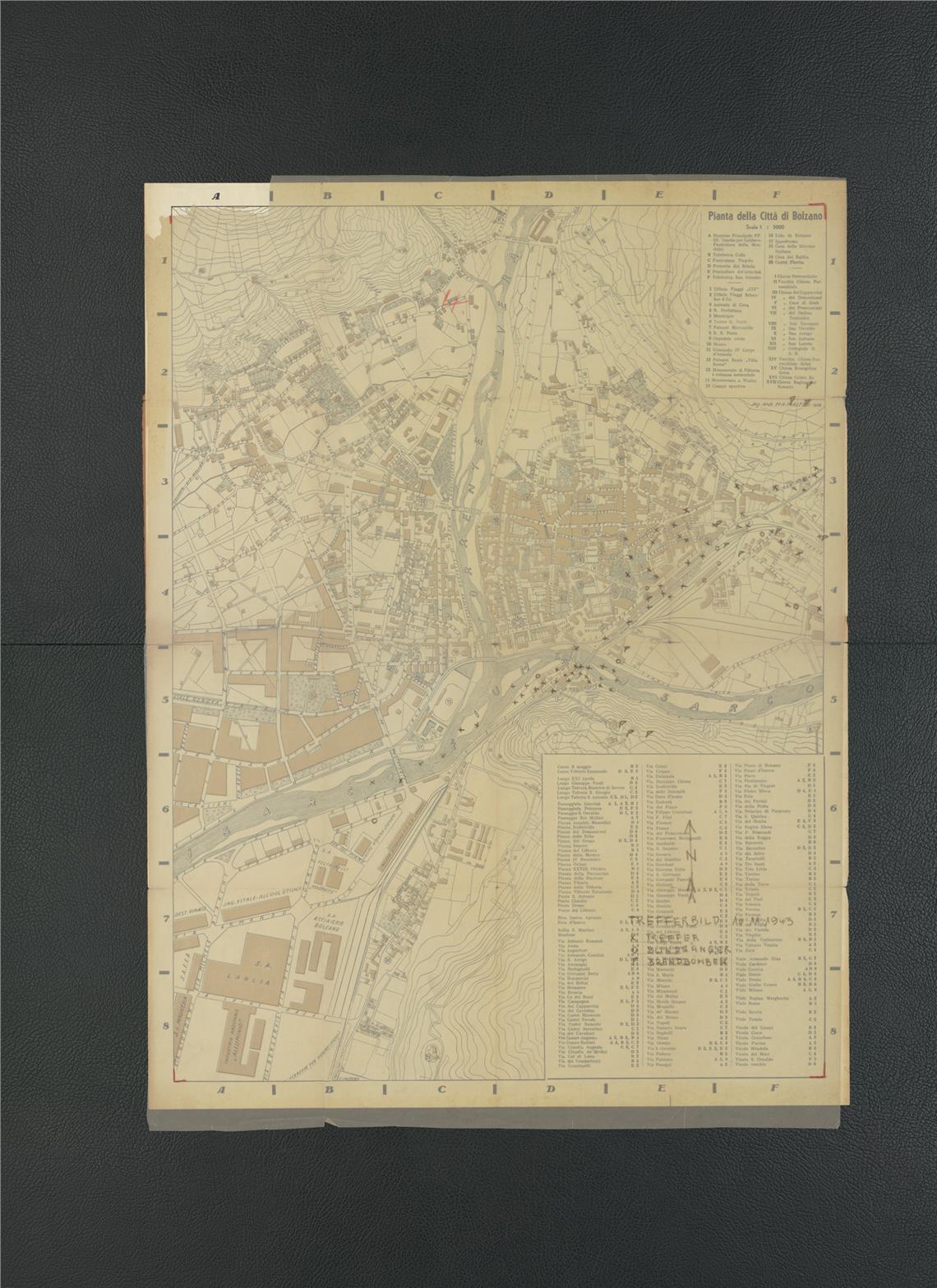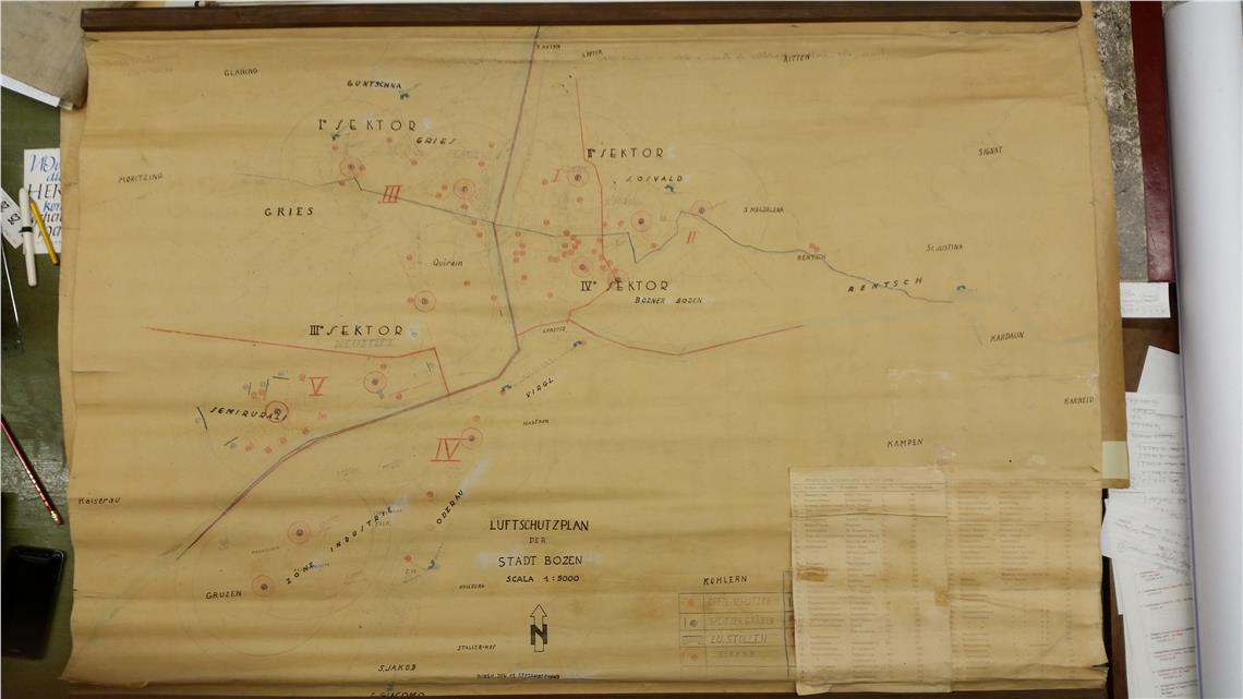 Heute (30. September) überreichte die Direktorin des Kuratoriums für Technische Kulturgüter Wittfrieda Mitterer gemeinsam mit Präsident Arthur Scheidle der öffentlichen Verwaltung sogenannte Trefferpläne aus den Kriegsmonaten zwischen September 1943 und Mai 1945: Die während der Kriegszeit eingeschlagenen Sprengkörper waren punktgenau auf den Katasterplan von Bozen übertragen worden, berichtete sie. Dieses Kartenmaterial mit verorteten Trefferbildern von Bomben, Blindgängern und Brandbombenstammt vom Kommando der örtlichen Luftschutzleitung der Schutzpolizei, die während des Zweiten Weltkrieges ihre Dienststelle im Kloster Muri-Gries hatte. Im Zuge der Recherchen am Bahnhofsareal von Bozen hat das Kuratorium für Technische Kulturgüter diesen Fundus entdeckt, gefunden wurden 9 Pläne von 13 Ereignissen.