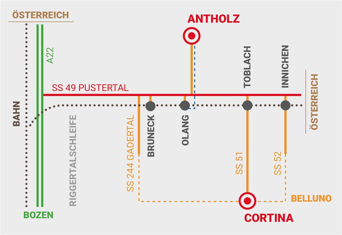 Umgesetzt werden insgesamt sieben wesentliche Infrastrukturprojekte. Dazu kommen weitere Begleitprojekte. "Wir wollen fünf große Ziele erreichen, und zwar eine bessere Anbindung an die Bahnhöfe und die Mobilitätszentren, bessere grenzüberschreitende Verbindungen nach Osttirol, Belluno und zur Brennerautobahn, einen insgesamt besseren Verkehrsfluss auf der Hauptachse, noch sicherere Verkehrswege und eine künftige gute Erreichbarkeit für die Wirtschaft", erklärt Alfreider.