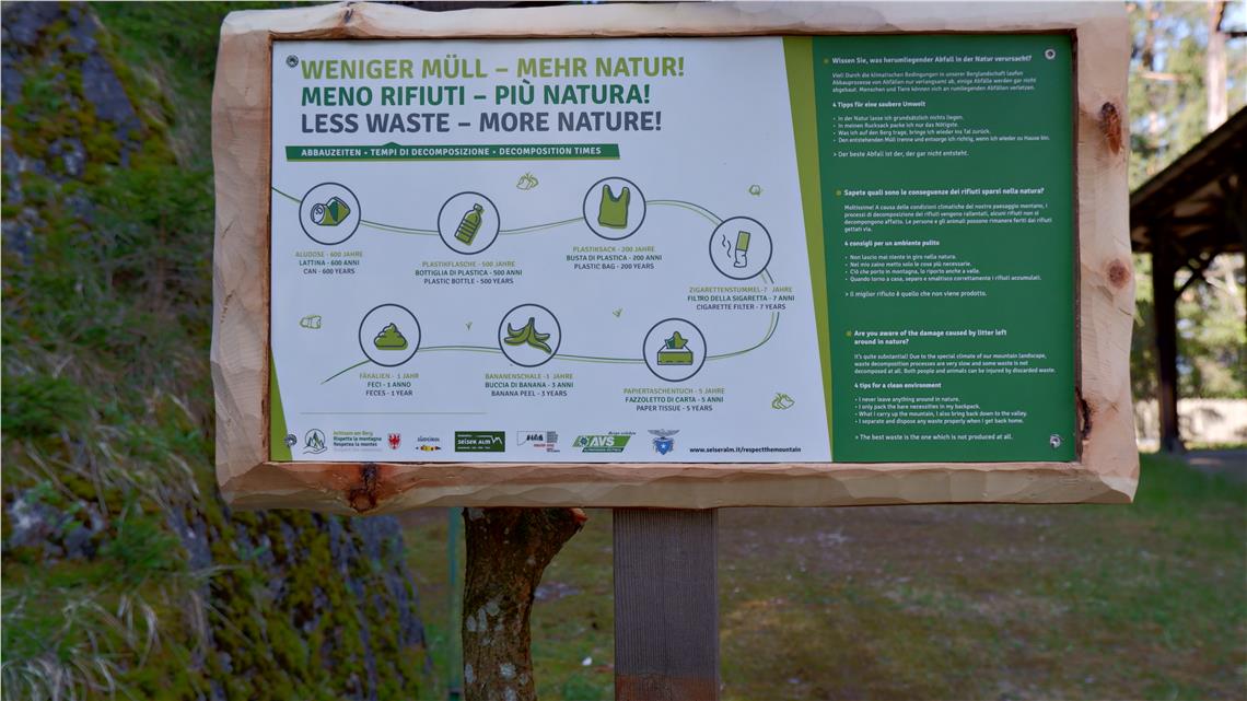 Pilotgebiet des Projekts "Achtsam am Berg" ist die Gemeinde Kastelruth mit den Tourismusvereinen Seis, Seiser Alm und Kastelruth. Nach Workshops mit den Interessensvertretern und der Erarbeitung von Maßnahmen im Jahr 2020 werden diese hier auf ihre Praxistauglichkeit überprüft und auch mit Hilfe von Pilotbetrieben verwirklicht. Für den Themenbereich Abfallvermeidung bedeutet das etwa, dass eine Wanderbox für den Rucksack entwickelt wurde, um Verpackungsabfall zu vermeiden. Entlang bestimmter Wege läuft ein "Müll-Monitoring", um Abfallmenge und Abfallart zu erheben. Informationstafeln zu den Abbauzeiten in der Natur unterstützen zudem die Sensibilisierung und sollen verhindern, dass Abfälle achtlos in der Natur zurückgelassen werden. Das gilt neben Papiertaschentüchern vor allem für Hundekotsäckchen, die zum am häufigsten vorkommenden Müll in der Natur zählen, der zudem auch nur langsam verrottet.