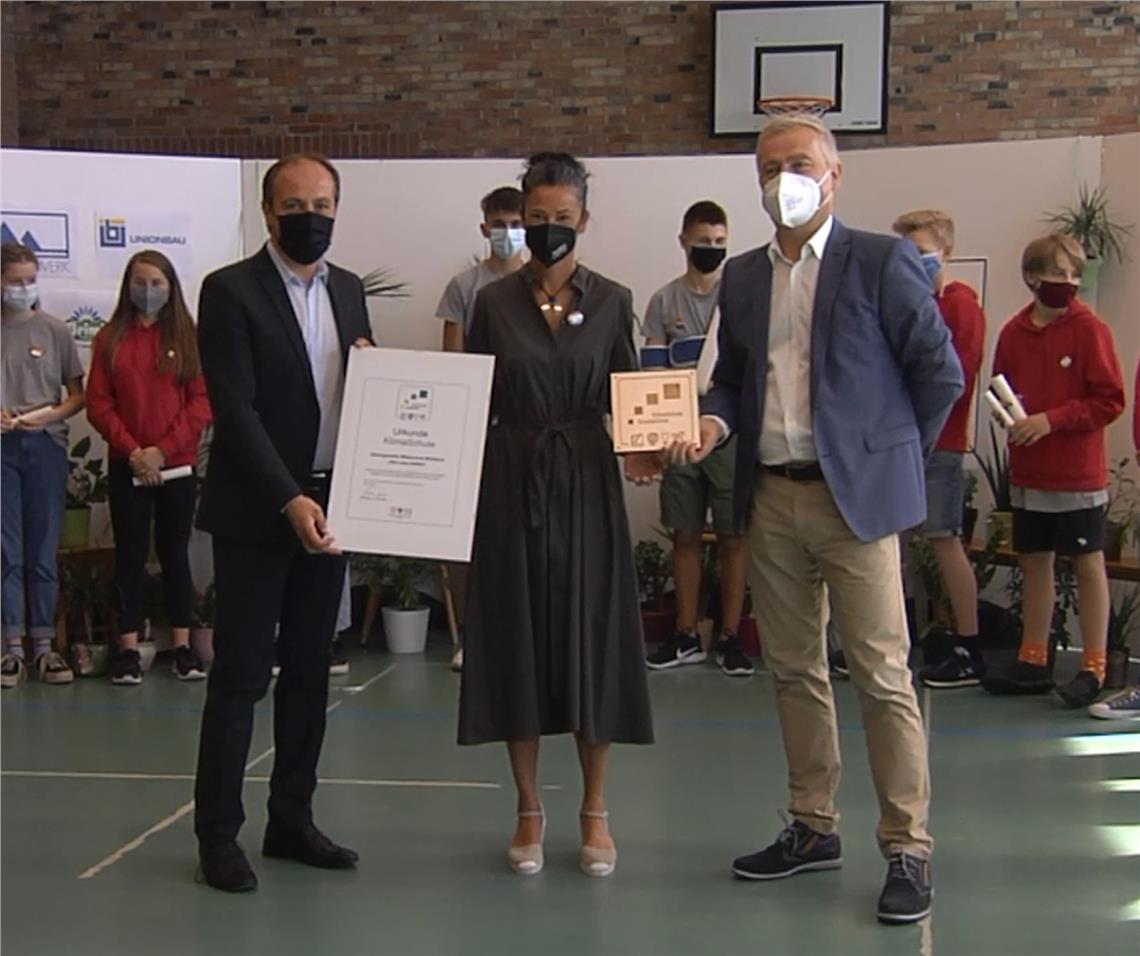 Das Schuljahr 2020/21 schließt an der Mittelschule in Mühlbach mit der Auszeichnung "KlimaSchule". LR Vettorato und KlimaHaus-Direktor Santa haben die Urkunde überreicht.