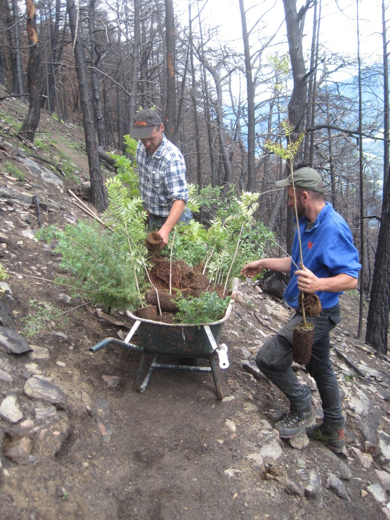 Die Forstarbeiter des Forstinspektorates Schlanders haben nach dem Waldbrand in Latsch umgehend mit den Aufräumarbeiten im Gelände begonnen und stark betroffene Schutzwaldbereiche mit Laubholz aufgeforstet. (Foto: LPA/Forstinspektorat Schlanders)