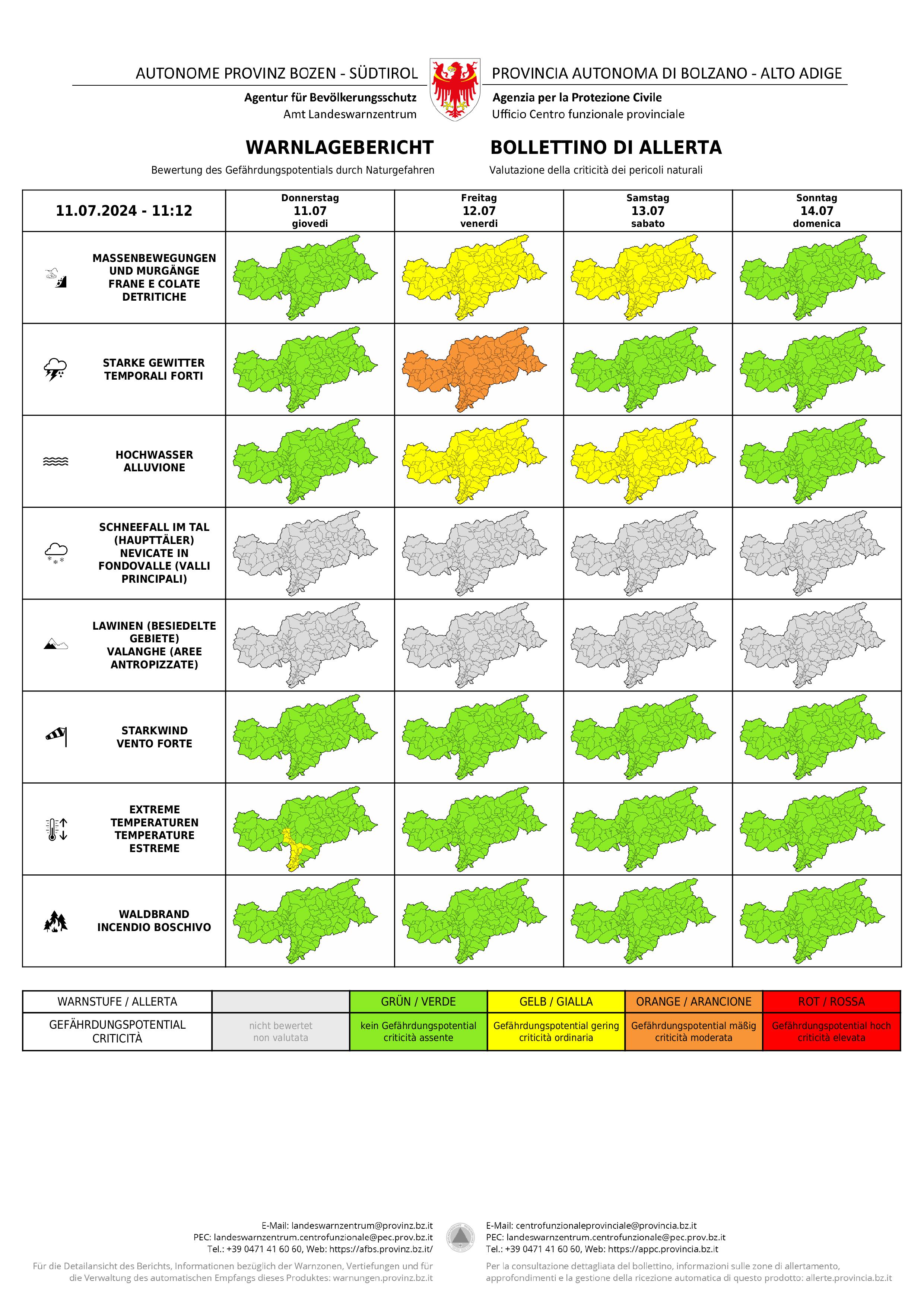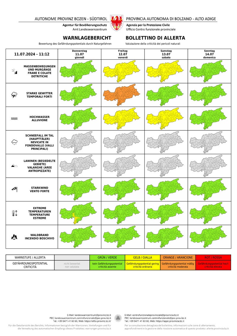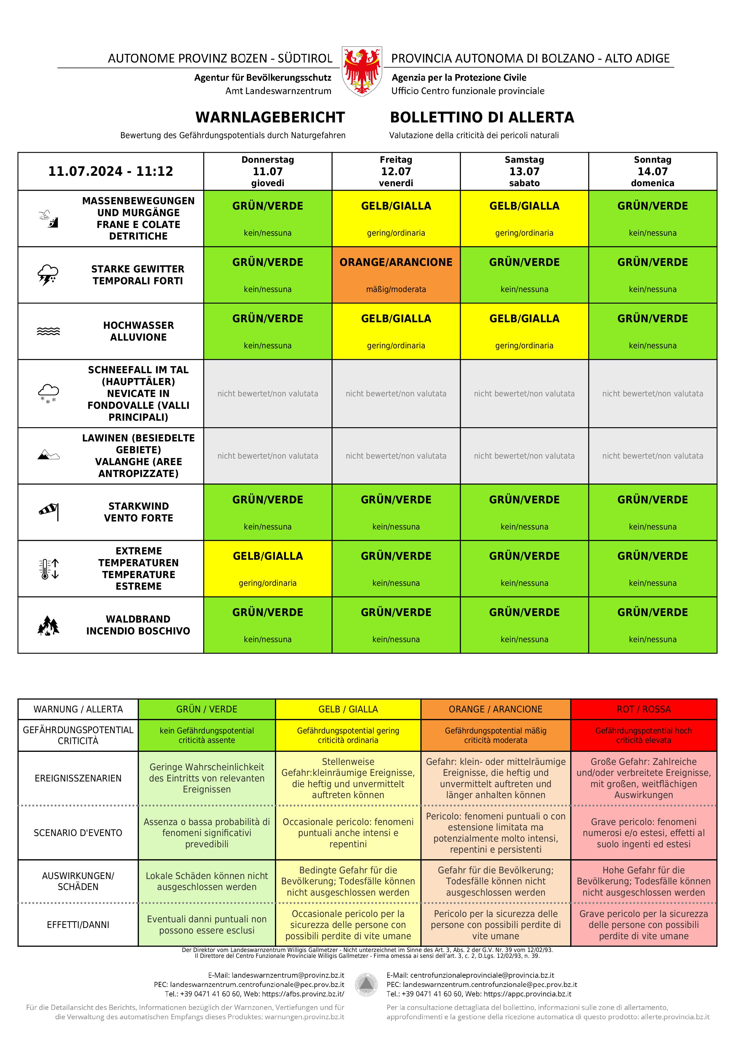 - Im Warnlagebericht des Landeswarnzentrums scheint morgen (Freitag, 12. Juli) im Hinblick auf starke Gewitter die Warnstufe Orange auf, bei Massenbewegungen und Hochwasser die Warnstufe Gelb. (Warnlagebericht des Landeswarnzentrums in der Agentur für Bevölkerungsschutz) » [IMG 979 kB]