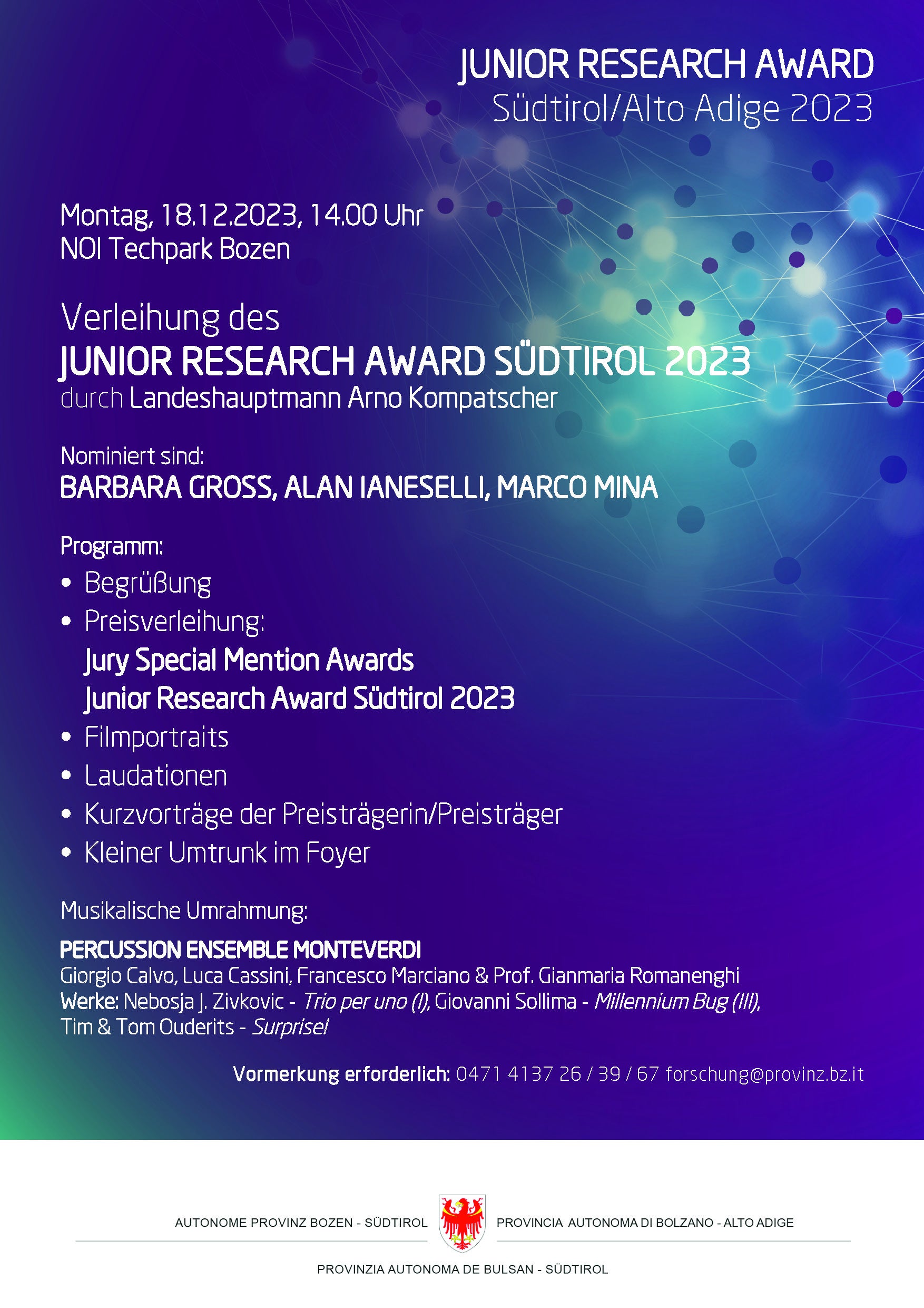 Mit dem Wissenschaftspreis "Junior Research Award Südtirol/Alto Adige" zeichnet das Land Südtirol alle zwei Jahre Wissenschaftlerinnen und Wissenschaftler aus, die am Beginn ihrer Karriere (Junior Researcher) stehen, sich aber in ihrem Forschungsbereich bereits hervorgetan haben. Neben dem mit 10.000 Euro dotierten Junior Research Award vergibt das Land auch zwei Jury Special Mention Awards. In diesem Jahr sind die drei Forschenden Barbara Gross, Alan Ianeselli und Marco Mina als Preistragende nominiert. Die Arbeiten der drei Jungforschenden lassen auf eine vielversprechende wissenschaftliche Laufbahn schließen.