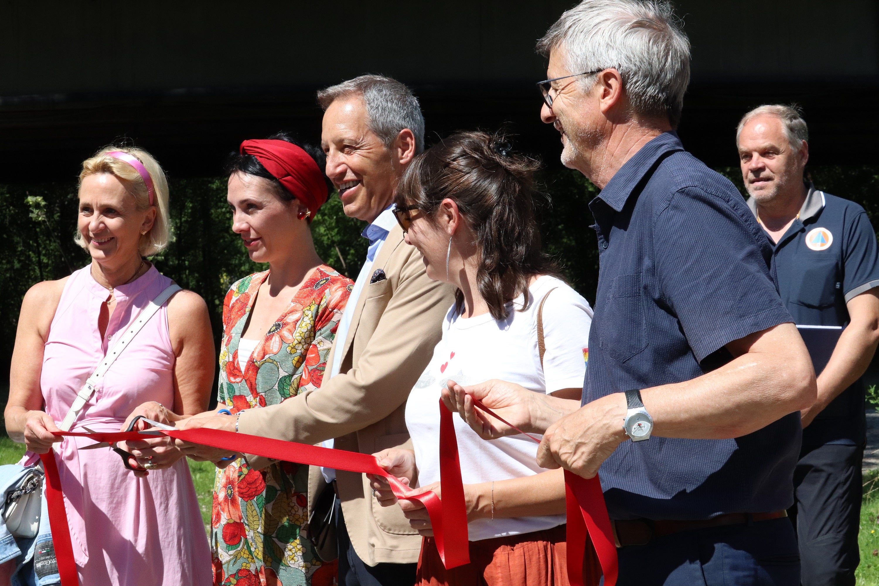 - Banddurchschneidung zur Eröffnung des neuen Flussparks an der Passermündung in Meran (von links): ehemalige Stadträtin Gabi Strohmer, Vizebürgermeisterin Katharina Zeller, Bürgermeister Dario Dal Medico, Jugend-Referentin Emanuela Albieri, Stadtrat für Soziales Stefan Frötscher, dahinter der Direktor des Landesamtes für Wildbachverbauung West Peter Egger (Foto: LPA/Maja Clara) » [IMG 1 MB]