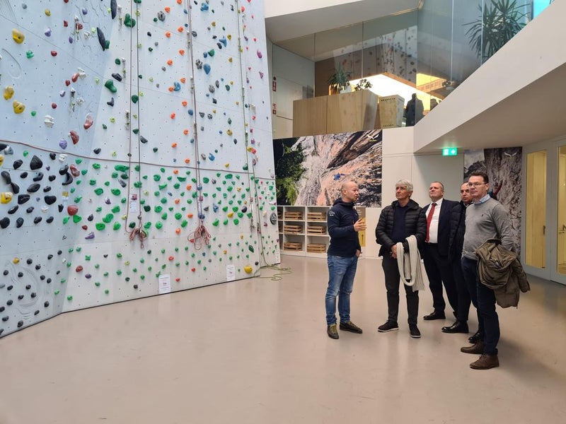Sportminister Abodi hat am 20. Jänner in Bruneck das Kletterzentrum und die Intercable Arena besichtigt. Mit Kompatscher, Alfreider und Griessmair hat Abodi sich über die Alps Ice Academy informiert.