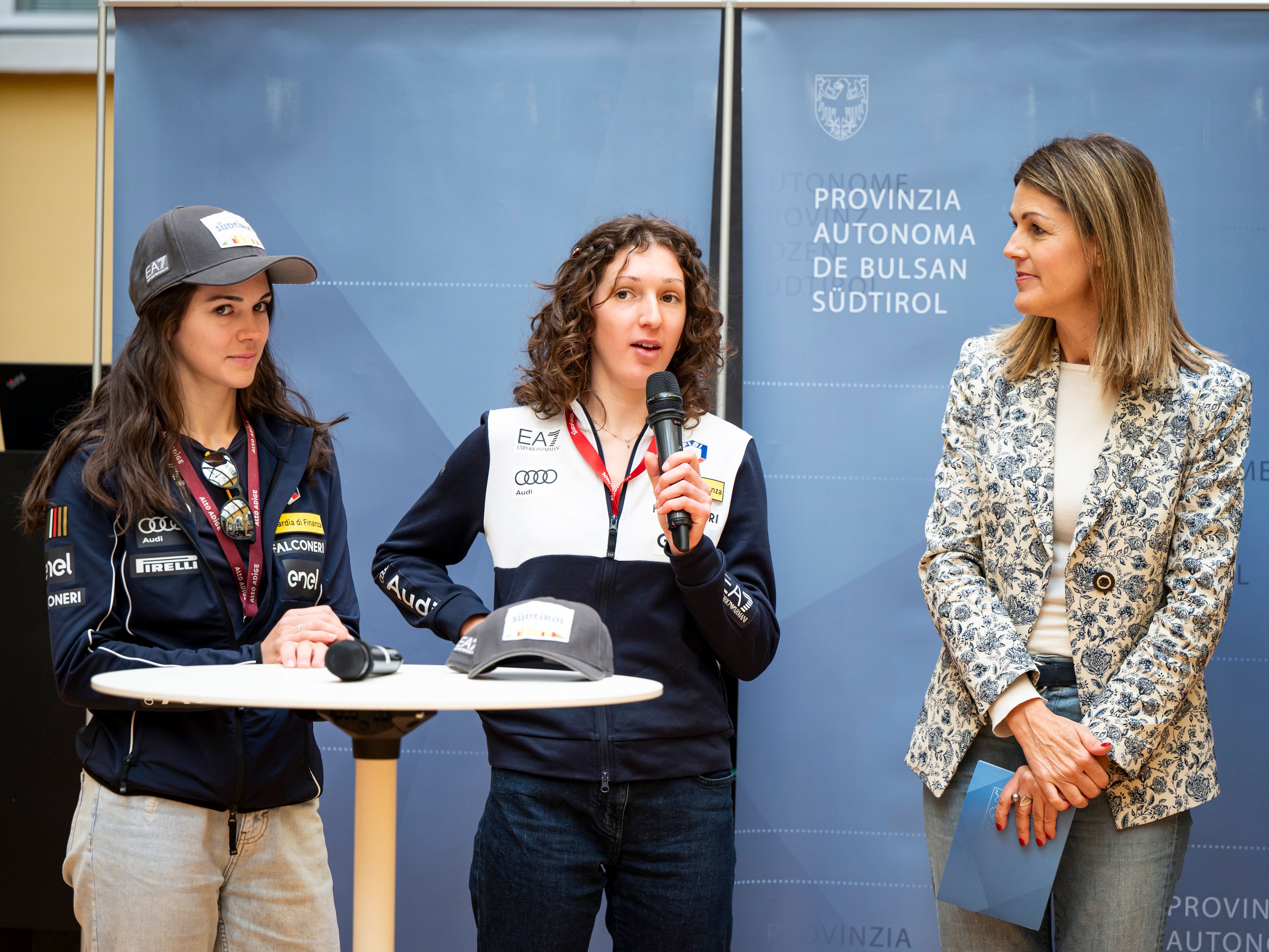 - Blicken mit Vorfreude auf die Olympischen Winterspiele 2026 (von links): die Grödner Skispringerinnen Lara und Jessica Malsiner (im Bild mit LPA-Direktorin Claudia Messner, die die Vorstellung des Sportjahrbuches 2024 moderierte). (Foto: LPA/Fabio Brucculeri) » [IMG 2 MB]