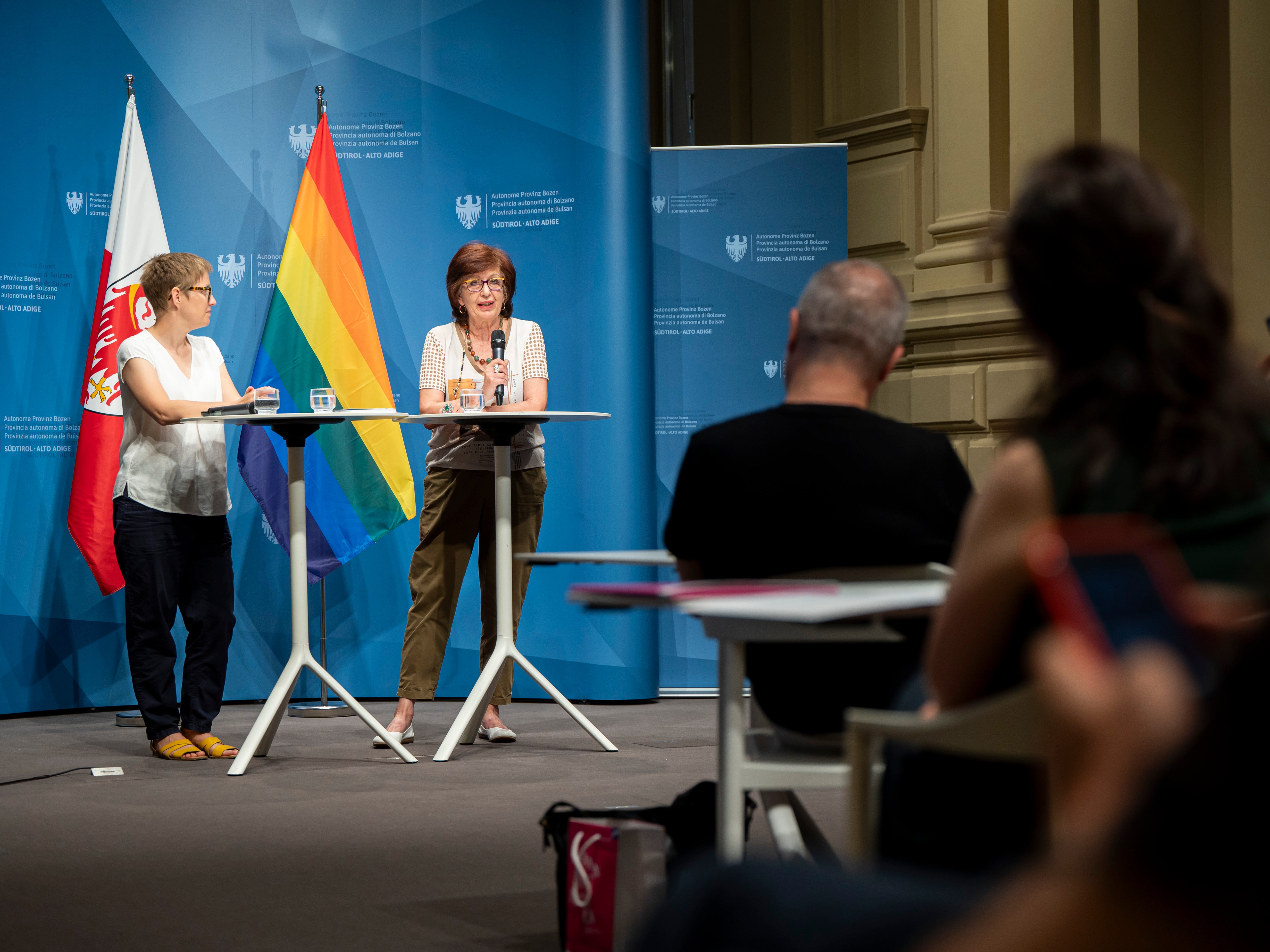 - Waltraud Pircher vom ersten Südtiroler Tonstudio Rekon berichtete von den Anfängen der Studioaufnahmen; im Bild mit Marlene Huber vom Landesamt für Film und Medien. (Foto: LPA/Fabio Brucculeri) » [IMG 2 MB]