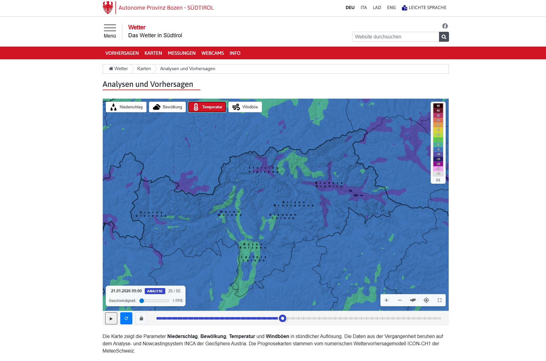 BOZEN (LPA). Interaktiv und dynamisch: So zeigt sich seit dem 21. Jänner das Wetterportal des Amtes für Meteorologie und Lawinenwarnung wetter.provinz.bz.it. Die Südtiroler Informatik AG SIAG hat in Zusammenarbeit mit dem Amt für Meteorologie und Lawinenwarnung die Wetterseite grundlegend überarbeitet. Die Zahl der Zugriffe auf das Landeswebportal mit Wetter ist mit Abstand die höchste: Über 70 Millionen Mal wurde die Wetterseite im vergangenen Jahr aufgerufen, nahezu 30 Millionen Besuche wurden gezählt.