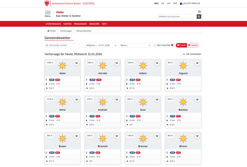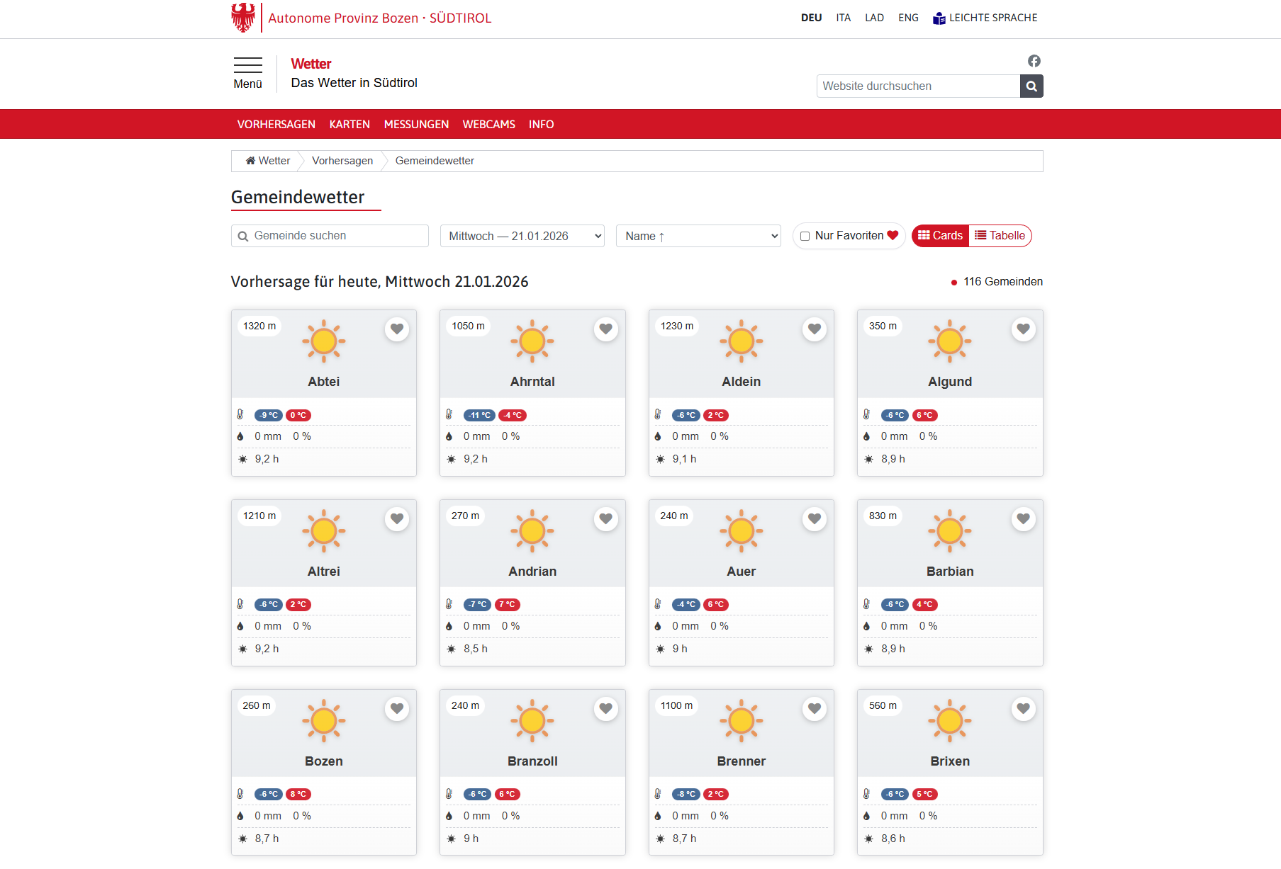 Neugestaltetes Wetterportal des Amtes für Meteorologie und Lawinenwarnung in der Agentur für Bevölkerungsschutz mit detailliertem Gemeindewetter und innovativen Widgets