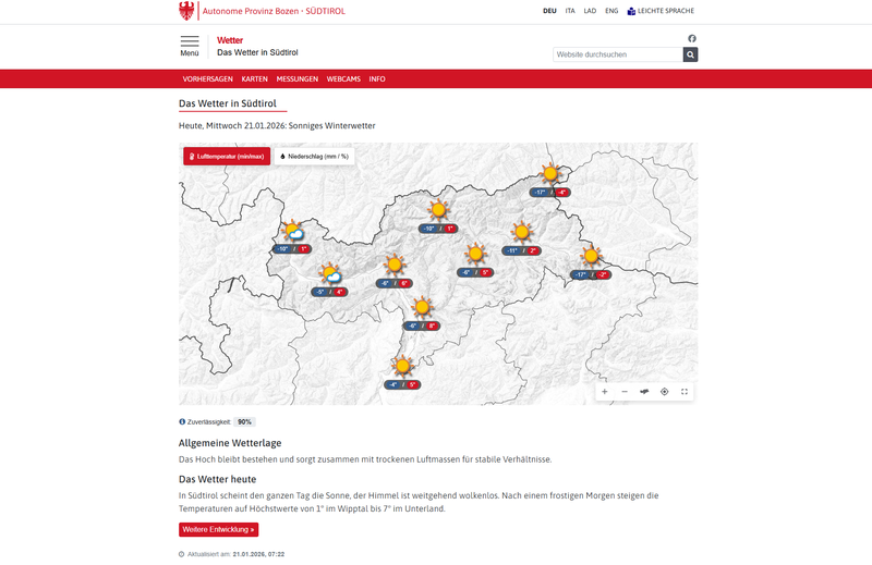 Auf die wichtigsten Neuerungen der Wetterseite weisen die Meteorologen des Landesamtes für Meteorologie und Lawinenwarnung hin: Die Wetterseite hat jetzt ein modernes Design und eine bessere Benutzerführung, sie wurde optisch und technisch neu gestaltet, um eine intuitive Navigation und schnelle Zugänglichkeit zu gewährleisten, sowohl am Desktop als auch mobil. Auch das detaillierte Gemeindewetter ist jetzt online und nun direkt auf der Website abrufbar statt wie bisher nur in der App verfügbar.