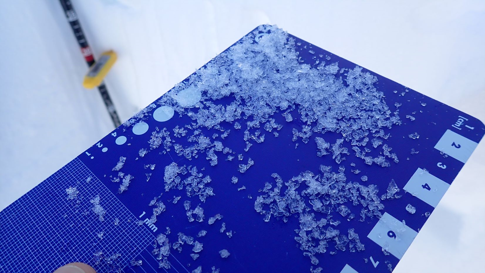 - Indagine del manto nevoso: cristalli angolari su una griglia di neve (Foto: Ufficio meteorologia e prevenzione valanghe /Servizio prevenzione valanghe Alto Adige ) » [IMG 2 MB]