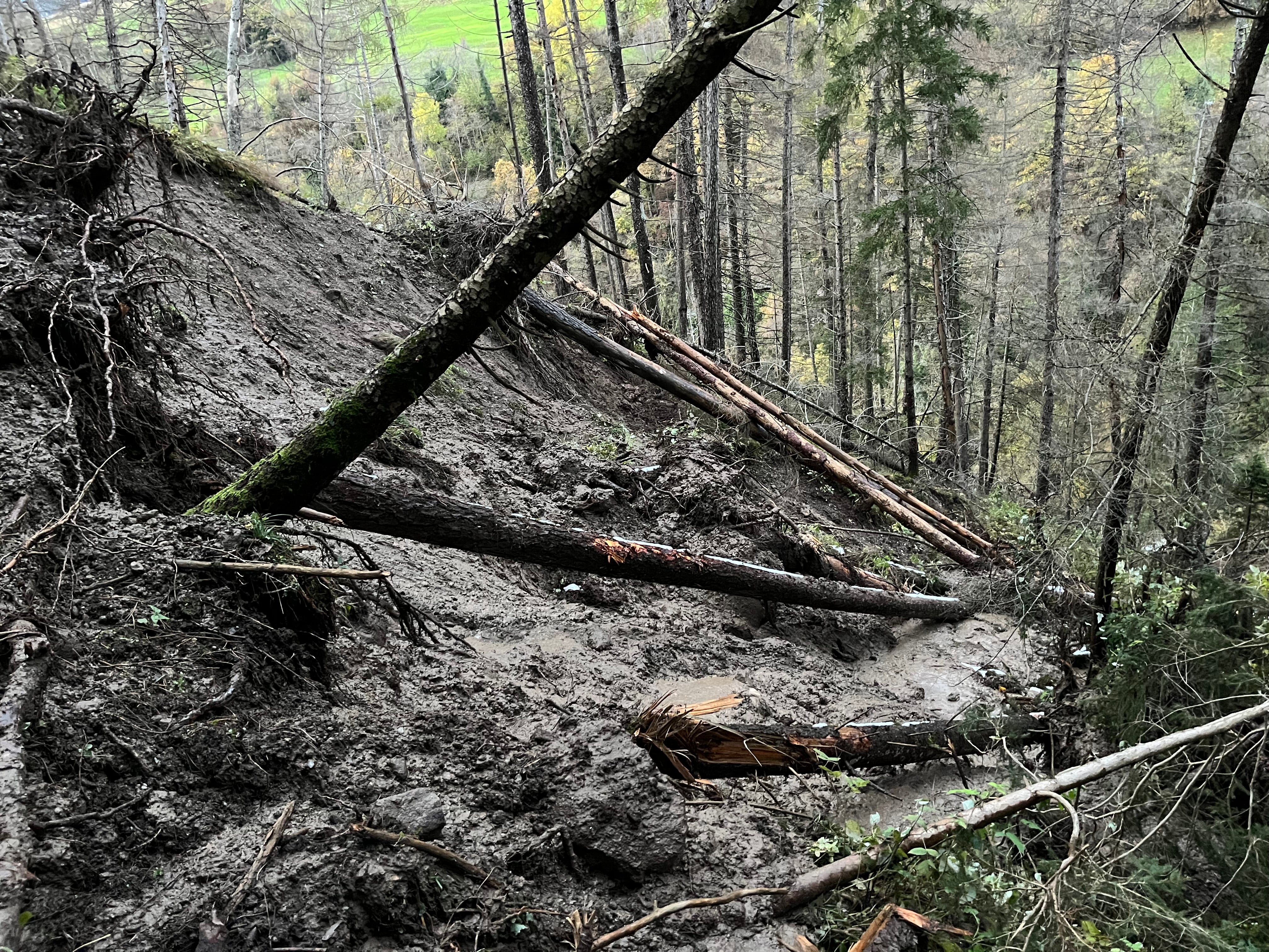 Di conseguenza, detriti, tronchi, radici e fango si sono depositati sulla strada e l'hanno interrotta in diversi punti. L’intero versante a monte della strada è stato gravemente danneggiato dal punto di vista idrogeologico e forestale e dovrà essere messo in sicurezza con urgenza mediante opportuni lavori di disboscamento e movimentazione terra.