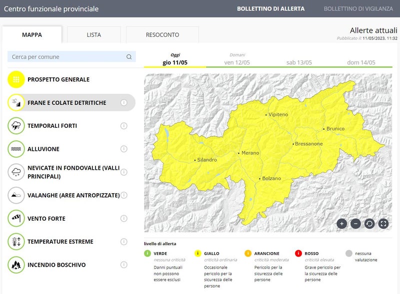 Il Centro Funzionale provinciale dell’Agenzia per la Protezione civile, mediante l’emissione ieri (10 maggio) del Bollettino di allerta, ha emesso un’allerta gialla (criticità ordinaria) per il rischio idrogeologico (frane e colate detritiche).