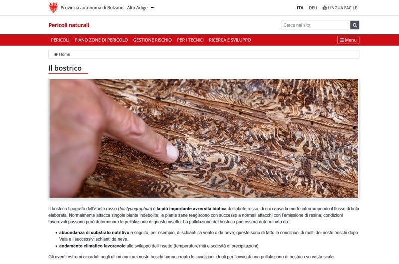 Oggi (21 febbraio) la Ripartizione provinciale Foreste lancia un'ampia campagna contro quello che attualmente è il pericolo maggiore per i boschi dell'Alto Adige: il bostrico, o più precisamente il bostrico dell'abete rosso, che attacca appunto soprattutto questi alberi. E l'abete rosso è la specie arborea più diffusa nei boschi altoatesini: rappresenta il 60% del soprassuolo. Oggi è online una nuova homepage con molte informazioni, inoltre vengono diffusi videoclip attraverso i social network, un video su YouTube e interviste ad esperti. Il messaggio è chiaro: informati contro il bostrico: guarda e agisci. I destinatari non sono solo i proprietari di boschi, ai quali è rivolto l'invito all'azione. "Il bostrico minaccia potenzialmente ogni singolo cittadino nella sua vita quotidiana, perché distrugge il bosco e quindi anche i boschi di protezione. Pertanto, l'Amministrazione provinciale si preoccupa d'informare tutti i cittadini", afferma l'assessore provinciale alle Foreste, Arnold Schuler.