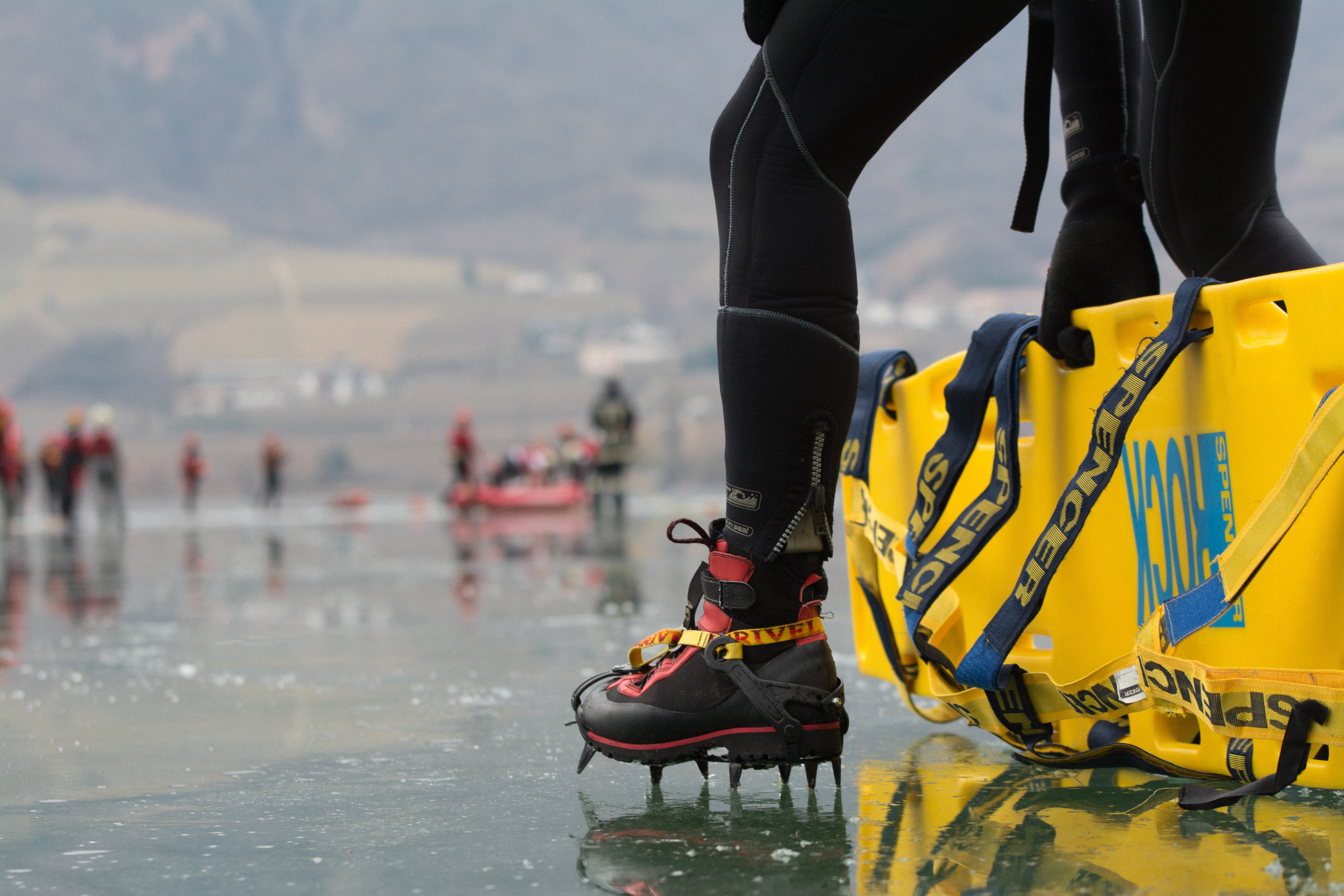- Fondamentale è prestate la massima attenzione quando si attraversa uno specchio d'acqua ghiacciato. (Foto: ASP/Corpo permanente Vigili del fuoco di Bolzano) » [IMG 9 MB]
