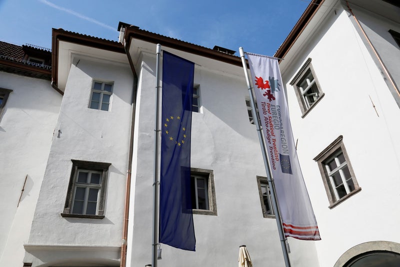 Le bandiere dell’Euregio e dell’Europa garriscono alla Casa della Pesa