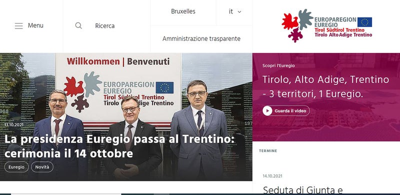 Da oggi, le cittadine e i cittadini potranno scoprire tutto sull'Euregio Tirolo-Alto Adige-Trentino e sulla rappresentanza a Bruxelles con un solo clic. Tra le novità, infatti, il nuovo sito dell’Euregio www.euregio.info offre il collegamento diretto a quello della rappresentanza dell’Euregio a Bruxelles, www.alpeuregio.org, che vi è integrato. La rappresentanza di Tirolo, Alto Adige e Trentino a Bruxelles è stata istituita nel 1995 a seguito di un accordo tra i governatori delle tre regioni, che vollero così dare vita al primo ufficio di collegamento transfrontaliero a Bruxelles.