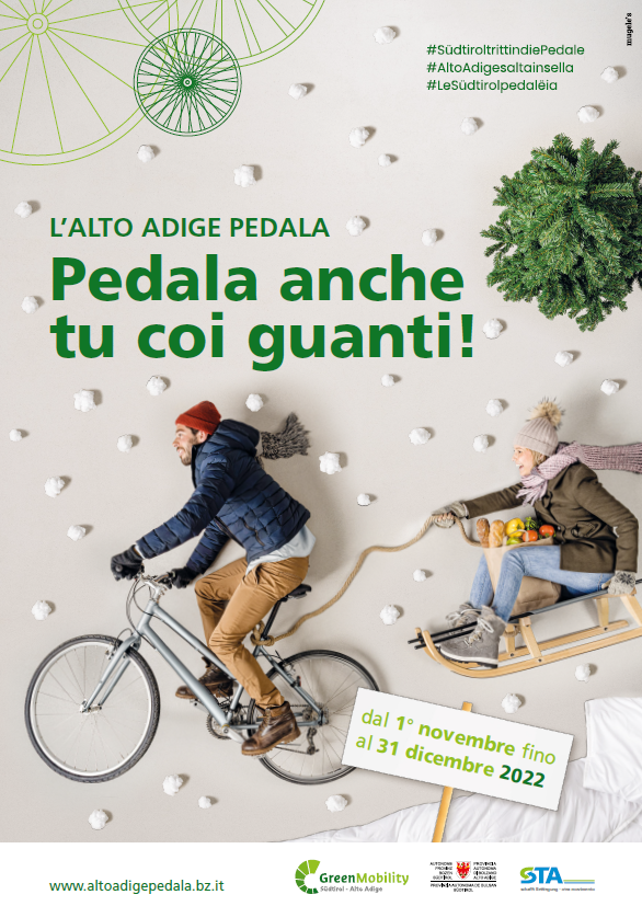 “L'Alto Adige pedala. Pedala anche tu coi guanti!” è un'iniziativa di Green Mobility della STA - Strutture Trasporto Alto Adige SpA. Ulteriori informazioni: www.altoadigepedala.bz.it.