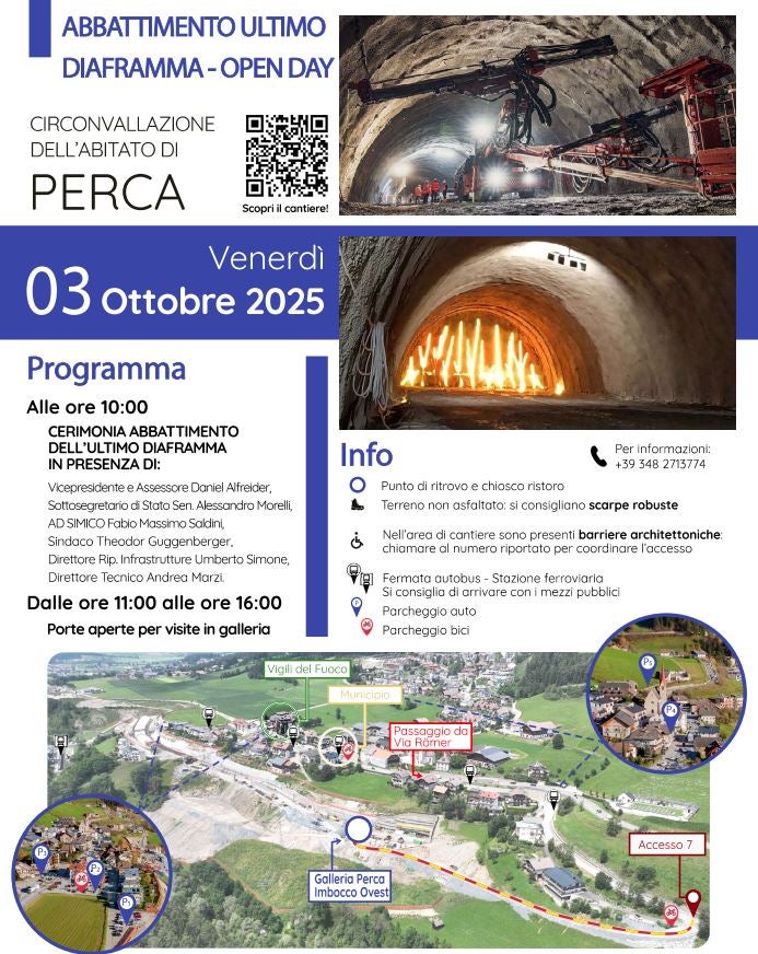 PERCA (USP). La circonvallazione di Perca è a un passo dal completamento: Il 3 ottobre si terrà la cerimonia di inaugurazione del tunnel, che sarà l'occasione per invitare il pubblico a vedere i lavori di costruzione. Anche i rappresentanti dei media sono invitati a partecipare alla cerimonia.