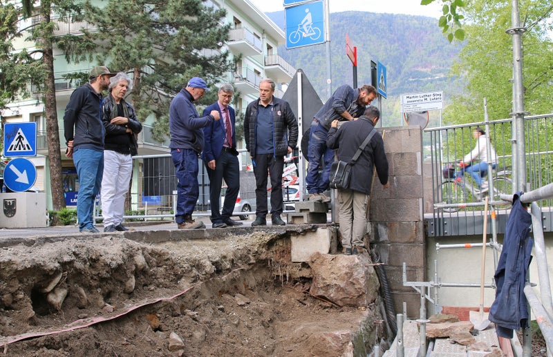Ieri (27 aprile) sopralluogo a Merano dei tecnici per verificare lo stato dei lavori di ristrutturazione dei muri di sponda nella zona di Ponte Teatro. Gli interventi saranno ultimati entro maggio.
